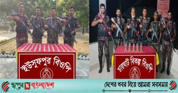 এছাড়াও সোমবার রাত আনুমানিক ৯:৩০ ঘটিকায় চারঘাট বিকল্প বিওপি’র আভিযানিক দল গোপন তথ্যের ভিত্তিে চারঘাট থানার চন্দন শহর নদীর পাড়ে আমবাগান এলাকায় অভিযান চালিয়ে ১০ বোতল ভারতীয় মদ এবং ১০০ পিস ভারতীয় ট্যাপেনটাডল ট্যাবলেট মালিকবিহীন অবস্থায় জব্দ করে। জব্দকৃত মাদকদ্রব্য চারঘাট থানায় জমা দেয়ার কার্যক্রম প্রক্রিয়াধীন।