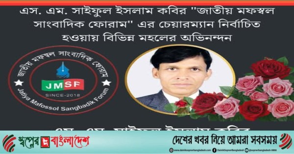 জাতীয় মফস্বল সাংবাদিক ফোরামের চেয়ারম্যান নির্বাচিত হওয়ায় বরেণ্য সাংবাদিক, লেখক ও সংগঠক এস. এম. সাইফুল ইসলাম কবির–কে দেশের বিভিন্ন সামাজিক, সাংস্কৃতিক ও পেশাজীবী সংগঠনের পক্ষ থেকে আন্তরিক শুভেচ্ছা ও অভিনন্দন জানানো হয়েছে।