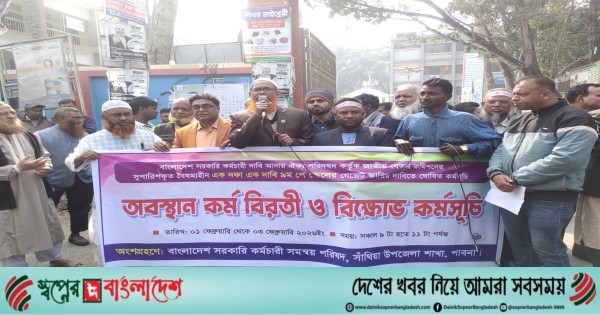 ৯ম পে স্কেল বাস্তবায়নের দাবিতে পাবনার সাঁথিয়য় মানববন্ধন ও বিক্ষোভ কর্মসূচি অনুষ্ঠিত হয়েছে। পাবনার সাঁথিয়য় সরকারি কর্মচারী সমন্বয় পরিষদের উদ্যোগে চলমান কর্মসূচির অংশ হিসেবে নবম পে স্কেল বাস্তবায়নের দাবিতে অবস্থান কর্মসূচি ও বিক্ষোভ কর্মসূচি অনুষ্ঠিত হয়েছে।