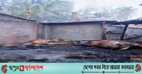 গত রোববার দিবাগত রাতে কয়েলের আগুনে গোয়ালঘরে থাকা গরু দুটি পুড়ে মারা যায়।