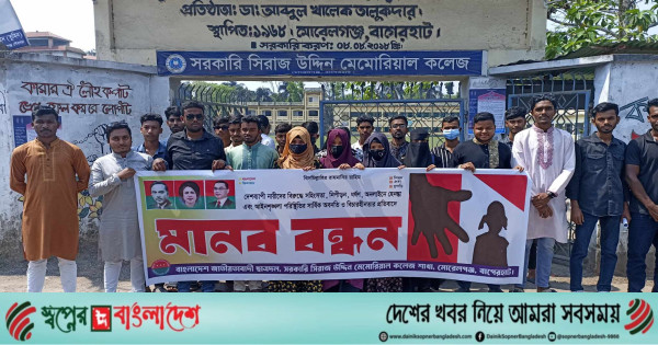 সোমবার বেলা ১২ টায় সরকারী সিরাজউদ্দিন মেমোরিয়াল কলেজের মূল ফটকের সড়কে জাতীয়তাবাদী ছাত্রদল কলেজ শাখার ব্যানারে এ মানব বন্ধনে শতাধিক কলেজ শিক্ষার্থীরা অংশ নেয়।