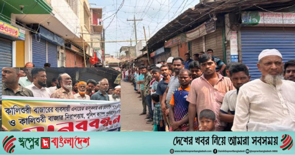 সোমবার (১৭ মার্চ) সকাল ১০টার দিকে কালিশুরী বাজারের প্রধান সড়কে ব্যবসায়ী ও এলাকাবাসীর উদ্যোগে মানববন্ধন অনুষ্ঠিত হয়। এতে ব্যবসায়ী, স্থানীয় জনপ্রতিনিধি, ছাত্র-যুবকসহ শতাধিক মানুষ অংশ নেন।