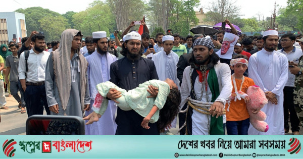 মৃত শিশুর লাশ কোলে নিয়ে কখনো আর্তনাদ আবার কখনো শোকে স্তব্ধ ফিলিস্তিনি এক পিতা। আর তার গলায় বিশ্বমোড়লদের বাঁধা শেকল আর উপহাস। তার পাশেই আনেকটা তোসামোদি রূপে দাড়ি মুসলিম নেতৃত্ব। এমন দৃশ্যের আবতারনা করে ফিলিস্তিন পরিস্থিতি তুলে ধরেছে রাজশাহী বিশ্ববিদ্যালয়ের শিক্ষার্থীরা। তাতে বেলা ১১ টা থেকে রাজশাহী বিশ্ববিদ্যালয়ের পুরো প্যরিসরোড যেন একখন্ড ফিলিস্তিন হিসেবে ফুটে উঠলো। আর এ অবস্থায় ইজরাইলের এমন বর্বর হত্যাকান্ডের বিচার, প্রতিবাদ আর বয়কটে ফেটে পড়লো বিশ্ববিদ্যালয়ের শিক্ষক, শিক্ষার্থী, কর্মকর্তা কর্মচারীরা।