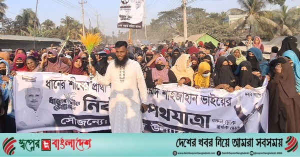 ‘ভোট দিব কিসে, ধানের শীষে’, ‘এই আসনে প্রার্থী যারা, মোহাম্মদ শাহজাহান সবার সেরা’,‘১২ তারিখ সারাদিন, ধানের শীষে ভোট দিন’—এমন নানা স্লোগান দেন।