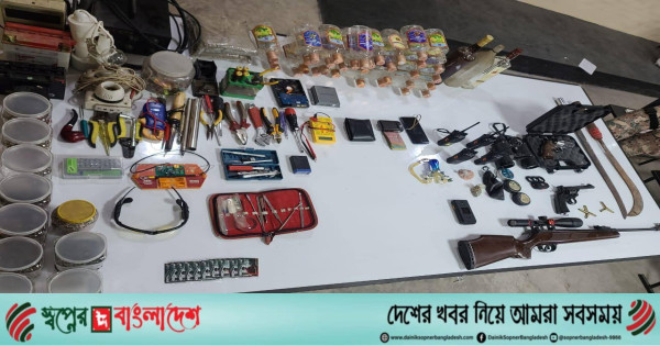 সেনাবাহিনীর সূত্র বলছেন, ডক্টরস ইংলিশ নামের ওই প্রতিষ্ঠানে অভিযান চালিয়ে দুটি বিদেশী এয়ার গান, একটি রিভালবার, সঠিক কর্টিজ, ইয়ারগান শিশা তিন বক্স, ম্যাগনেট একটি, দেশীয় অস্ত্র ৬ টি, জিপিএস একটি, ওয়াকিটকি ৪টি, ট্রাজারগান একটি, সিমকার্ড ১০ টি, বাইনোকুলার একটি, বিস্ফোরক তৈরীর সরঞ্জাম, পাসপোর্ট, এন আই ডি, মনিটর ছয়টি, কম্পিউটার তিনটি, স্ক্যানার তিনটি ও মদের বোতল ৩৫টি উদ্ধার করেছে।