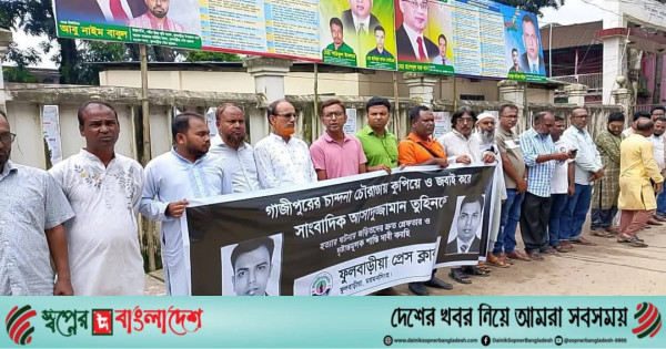 গাজীপুরের চান্দনা চৌরাস্তা এলাকায় নির্মমভাবে নিহত সাংবাদিক আসাদুজ্জামান তুহিন হত্যাকাণ্ডের বিচার দাবিতে ময়মনসিংহের ফুলবাড়িয়ায় মানববন্ধন করেছে স্থানীয় সাংবাদিকরা। শুক্রবার (৮ আগস্ট ২০২৫) সকাল সাড়ে ১১টায় উপজেলা পরিষদ চত্বরে এ কর্মসূচি অনুষ্ঠিত হয়।