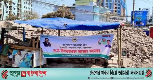 ২০২৪ সালের ৫ আগস্ট ছাত্র-জনতার গণঅভ্যুত্থানের পর কয়েক দফা বুলডোজার দিয়ে গুঁড়িয়ে দেওয়া হয়েছিল রাজশাহী মহানগর আওয়ামী লীগের এই প্রধান কার্যালয়টি। দীর্ঘ দিন ধ্বংসস্তূপ হিসেবে পড়ে থাকা সেই জায়গাতেই শুক্রবার দিবাগত রাতে কে বা কারা একটি ‘উদ্বোধনী’ ব্যানার টাঙিয়ে দিয়ে যায়। শনিবার সকালে বিষয়টি জানাজানি হলে স্থানীয় রাজনৈতিক মহলে নতুন করে উত্তেজনা ছড়িয়ে পড়ে।