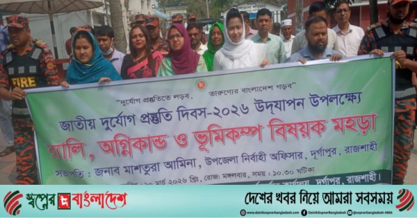 “দুর্যোগ প্রস্তুতিতে লড়ব, তারুণ্যের বাংলাদেশ গড়ব” এই প্রতিপাদ্যকে সামনে রেখে রাজশাহীর দুর্গাপুরে জাতীয় দুর্যোগ দিবস-২০২৬ উদযাপিত হয়েছে।
