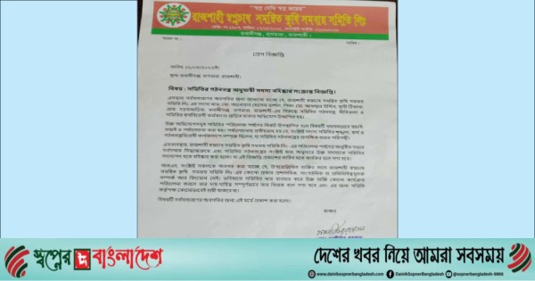 প্রেস বিজ্ঞপ্তিত্বে আরো জানানো হয়, অদ্য সময় থেকে রাজশাহী স্বপ্নচাষ সমন্বিত কৃষি সমবায় সমিতি লিমিটেডের বহিস্কৃত সদস্য আনোয়ার হোসেনের সাথে কেউ কোন ধরনের কর্মকান্ডের সাথে জড়িত থাকতে পারবেনা।