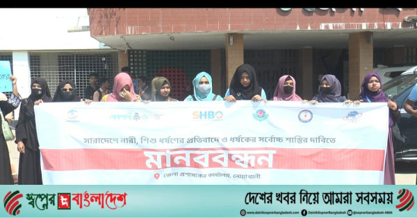 দেশব্যাপী নারী-শিশু ধর্ষণসহ সকল সহিংসতার প্রতিবাদে নোয়াখালীতে মানববন্ধন-সমাবেশ হয়েছে। এ সময় ধর্ষণকারীদের দ্রুত বিচারের আওতায় এনে সর্বোচ্চ শাস্তি নিশ্চিতের দাবি জানানো হয়।